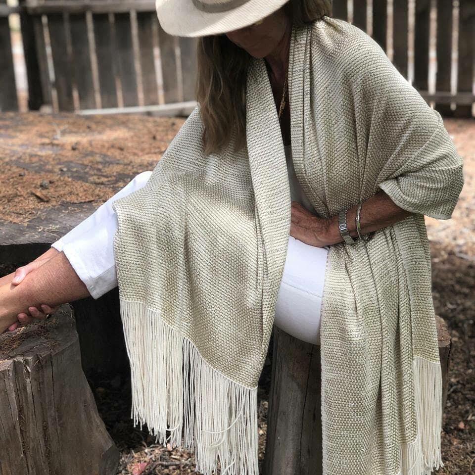 Hecha con lana merino de 18,9 micrones tramado en seda dorada.