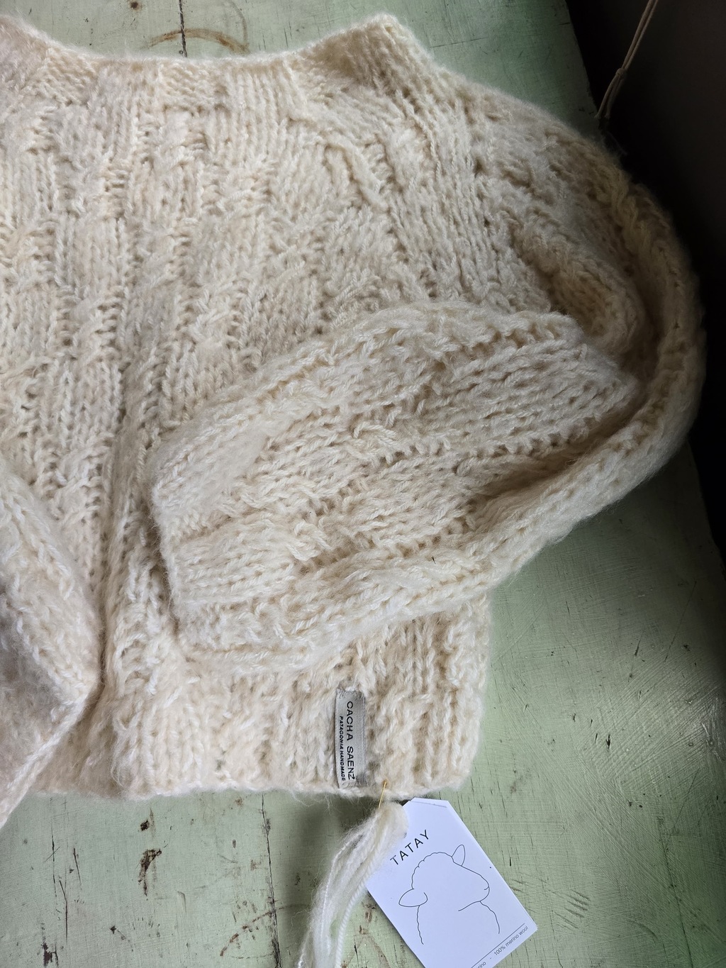 Esta prenda única surge de la fusión de la lana producida en Estancia Tatay y el delicado trabajo manual de Cacha Saenz.
