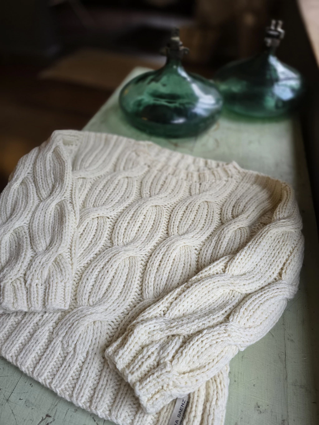Esta prenda única surge de la fusión de la lana producida en Estancia Tatay y el delicado trabajo manual de Cacha Saenz.